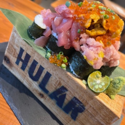 名物の「フラー過ぎる痛風太巻き」は、まぐろ・ウニ・いくらが豪快にのった迫力満点の一品。写真映え抜群で、旅の思い出にもなるインパクト大のメニューです。