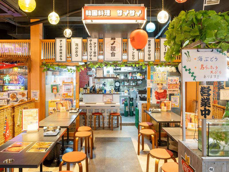 沖縄料理をはじめ、炭火焼き、タイ屋台料理、鉄板焼き、四川担担麺など、幅広いジャンルのグルメが楽しめます。
